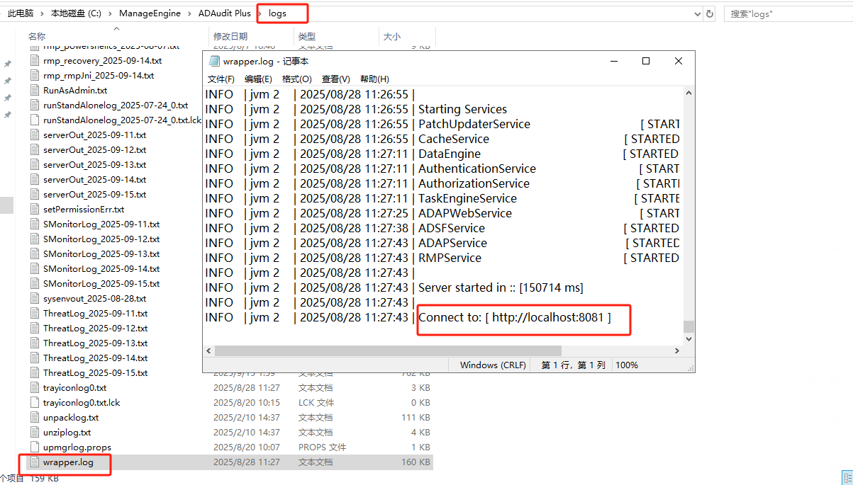 可以通过以下两种方式将ADMP安装为服务: 1. 执行服务命令InstallNTService.bat, 如下位置: 2. 开始里面选择ADManager Plus对应的安装目录下面的Install ADManager Plus Service. ----安装为服务后,启动该服务(ManageEngine ADManager Plus),,如下效果图: 从产品wrapper日志中查看服务是否已启动,如下效果为启动: