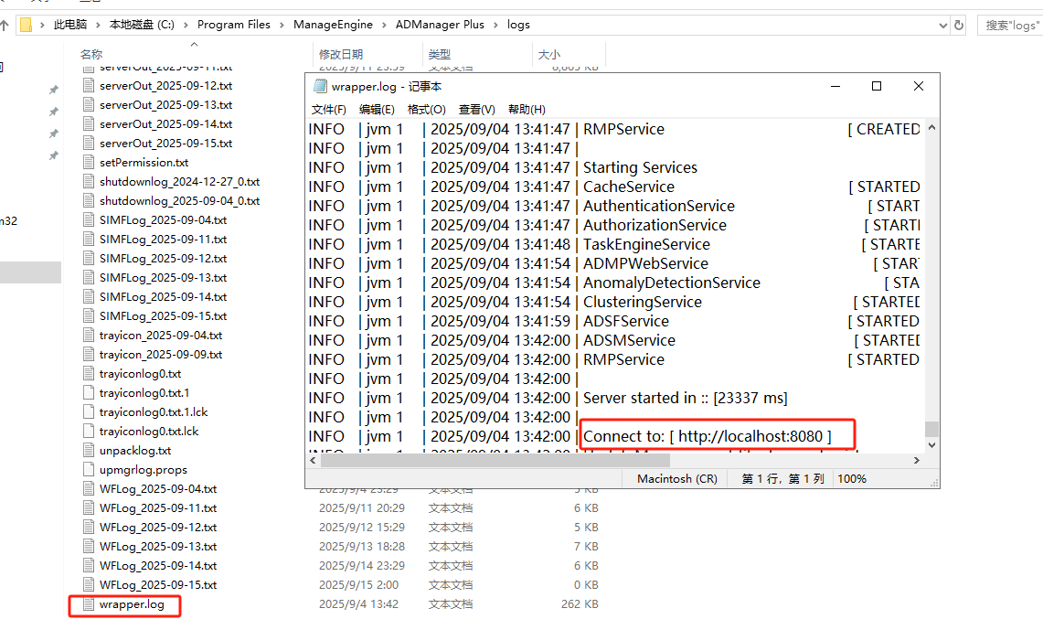 可以通过以下两种方式将ADAP安装为服务: 1. 执行服务命令InstallNTService.bat, 如下位置: 2. 开始里面选择ADAudit Plus对应的安装目录下面的Install ADAudit Plus Service. ----安装为服务后,启动该服务(ManageEngine ADAudit Plus),,如下效果图: 从产品wrapper日志中查看服务是否已启动,如下效果为启动: