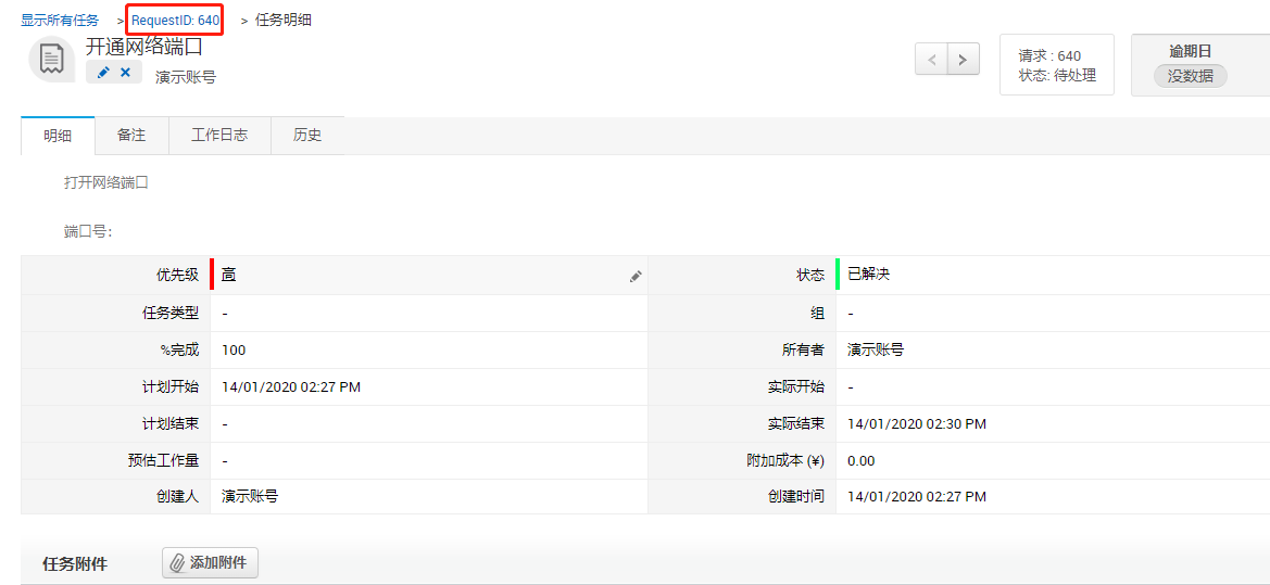 此外,在任务的明细窗口或页面,可以查看窗口顶部的任务路径,此路径也指示了任务的来源,点击请求或变更路径链接,页面也将会跳转到指定的页面。