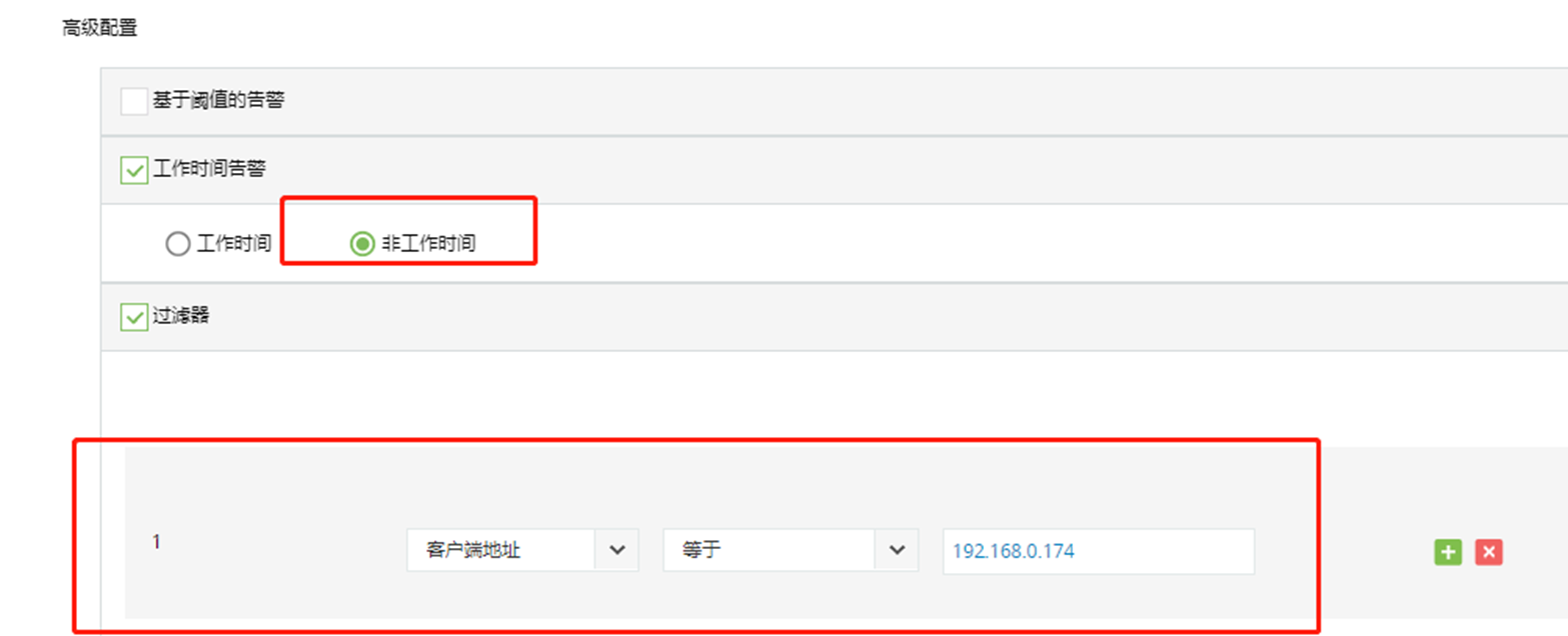 3.高级配置按照如下选择:过滤器的IP地址或者其它条件可以定义敏感设备,选择对应的通知方式,保存即可。