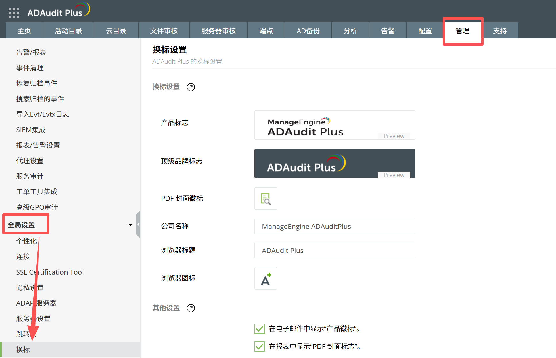 可以浏览到如下位置换标:管理--全局设置--换标