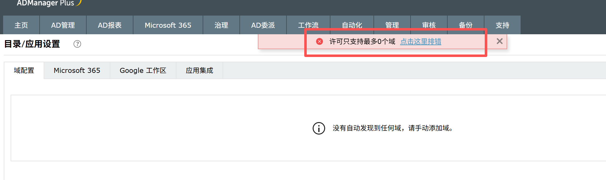 答:不可以,因为配置的第一步需要配置域,如果许可里面没有域的数量,应用后会变成下图所示: