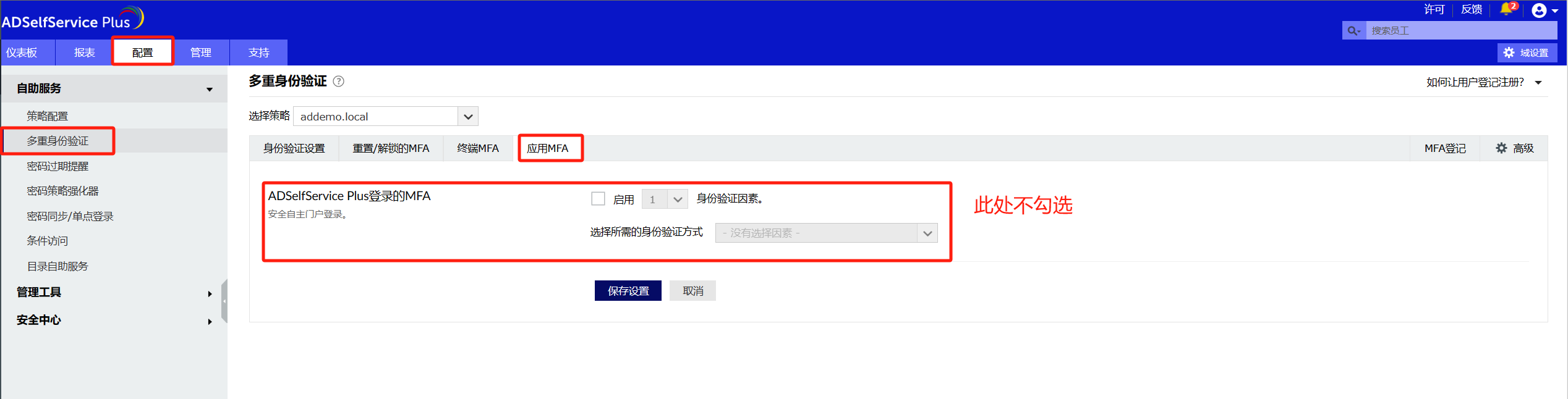 3. 配置-多重身份验证-应用MFA-ADSelfService Plus登录的MFA,此处不勾选,点击保存。