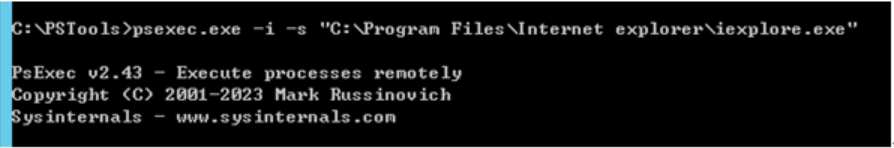 psexec.exe -i -s "C:\Program Files(x86)\Internet explorer\iexplore.exe" 或者psexec.exe -i -s "C:\Program Files\Internet explorer\iexplore.exe" and click on agree,此操作将使用本地系统账号启动IE(This will open IE in your Local System account)