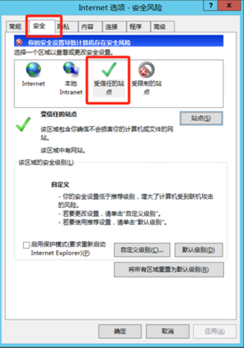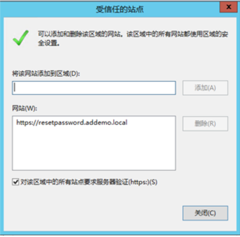 5. 在自动弹出的IE浏览器下,找到Internet选项-安全-受信任的站点-点击”站点”-添加访问adssp的url(https)-关闭窗口。