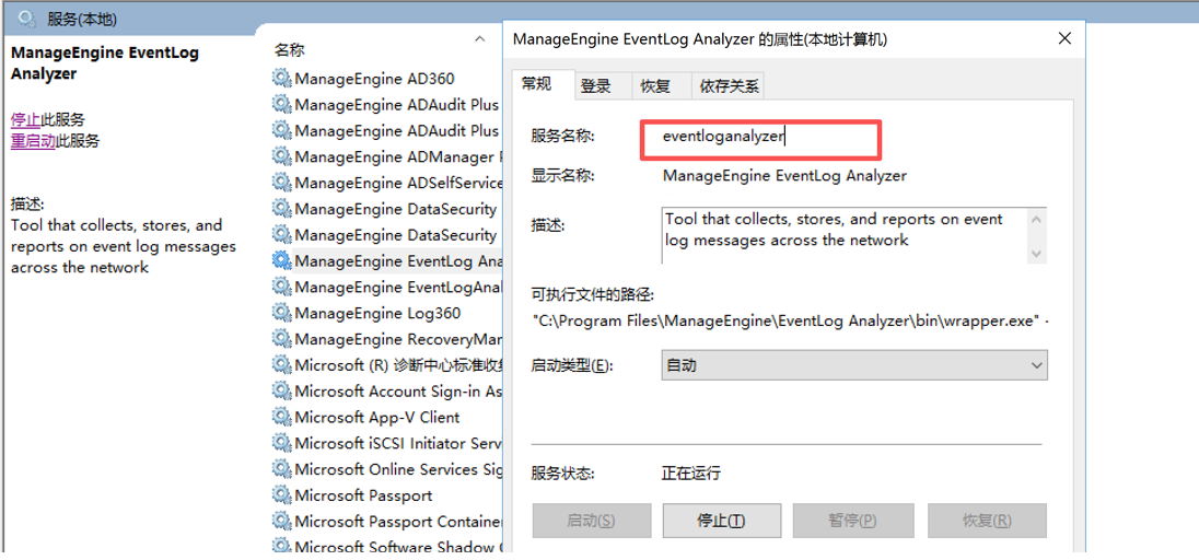 Analyzer 服务操作路径:开始 → 运行 → 输入 services.msc 并点击确定 → 找到 ManageEngine EventLog Analyzer 服务并停止