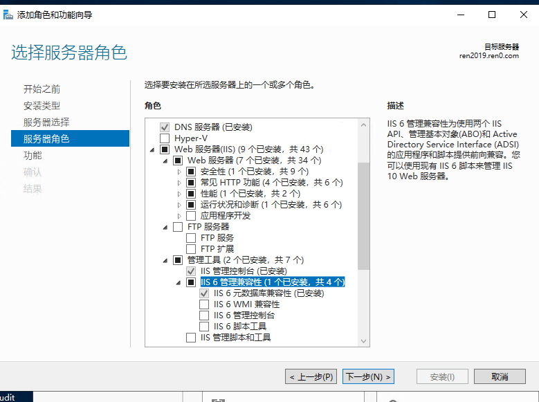 像 IIS 这样的组件,在服务器上被归类为 “Web 服务器(IIS)” 角色,需要先添加角色,再在角色服务中选择具体功能(如 IIS 6 管理兼容性)。