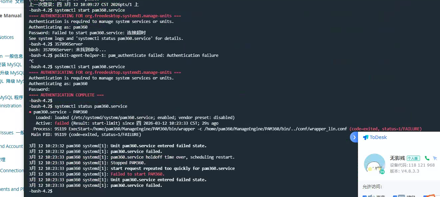 直接停止服务(此时它处于被 systemd 管控的失败状态):sudo systemctl stop pam360.service3 最后再启动一次服务。sudo systemctl start pam360.service