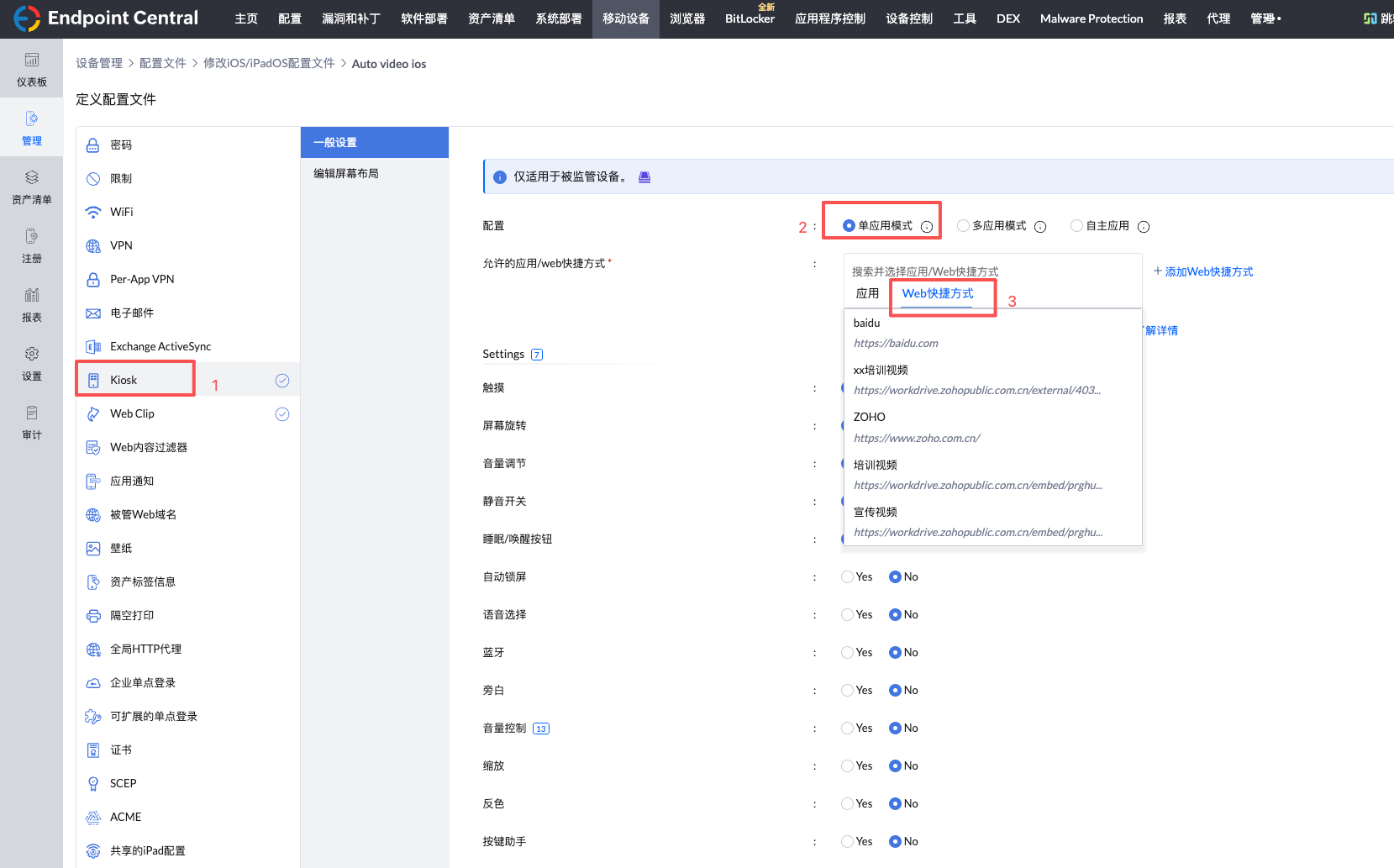 2)配置Kiosk 单应用,选择Web快捷方式,选择已添加的Web Clip,保存并发布配置文件。如下图: