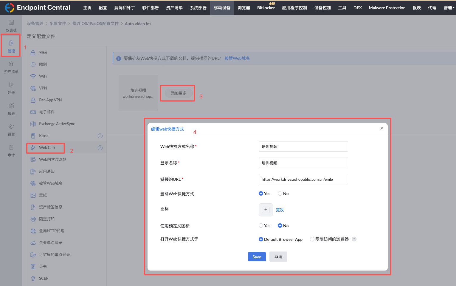 1) 创建 Web Clip,设置名称及其他参数,并输入上述视频链接,保存。如下图: