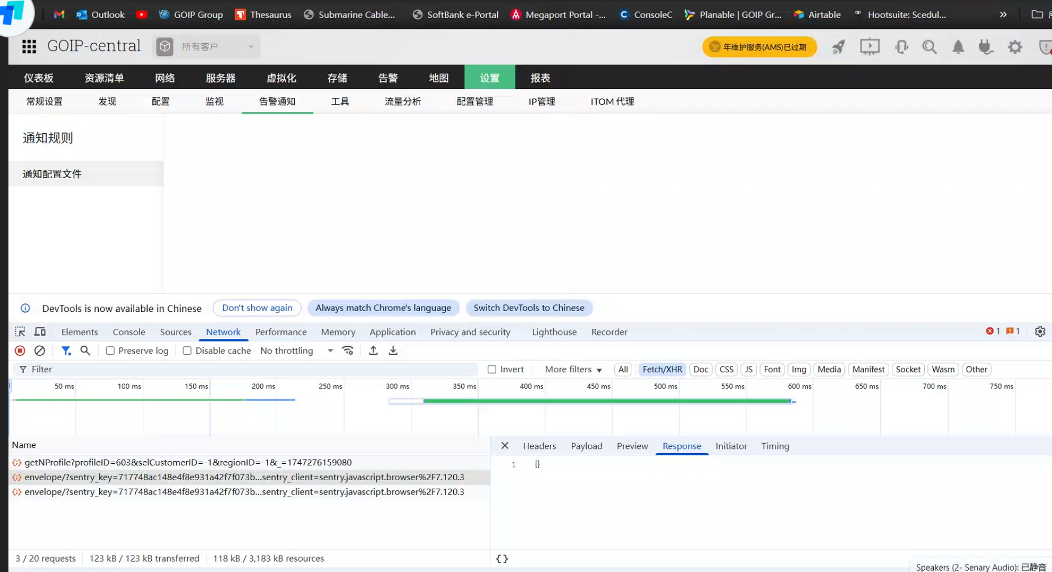 客户版本为OPM MSP,中心以及探针都部署在windows中,产品安装语言为中文。在中心点击通知配置文件时,中文页面无响应,英文页面响应正常。