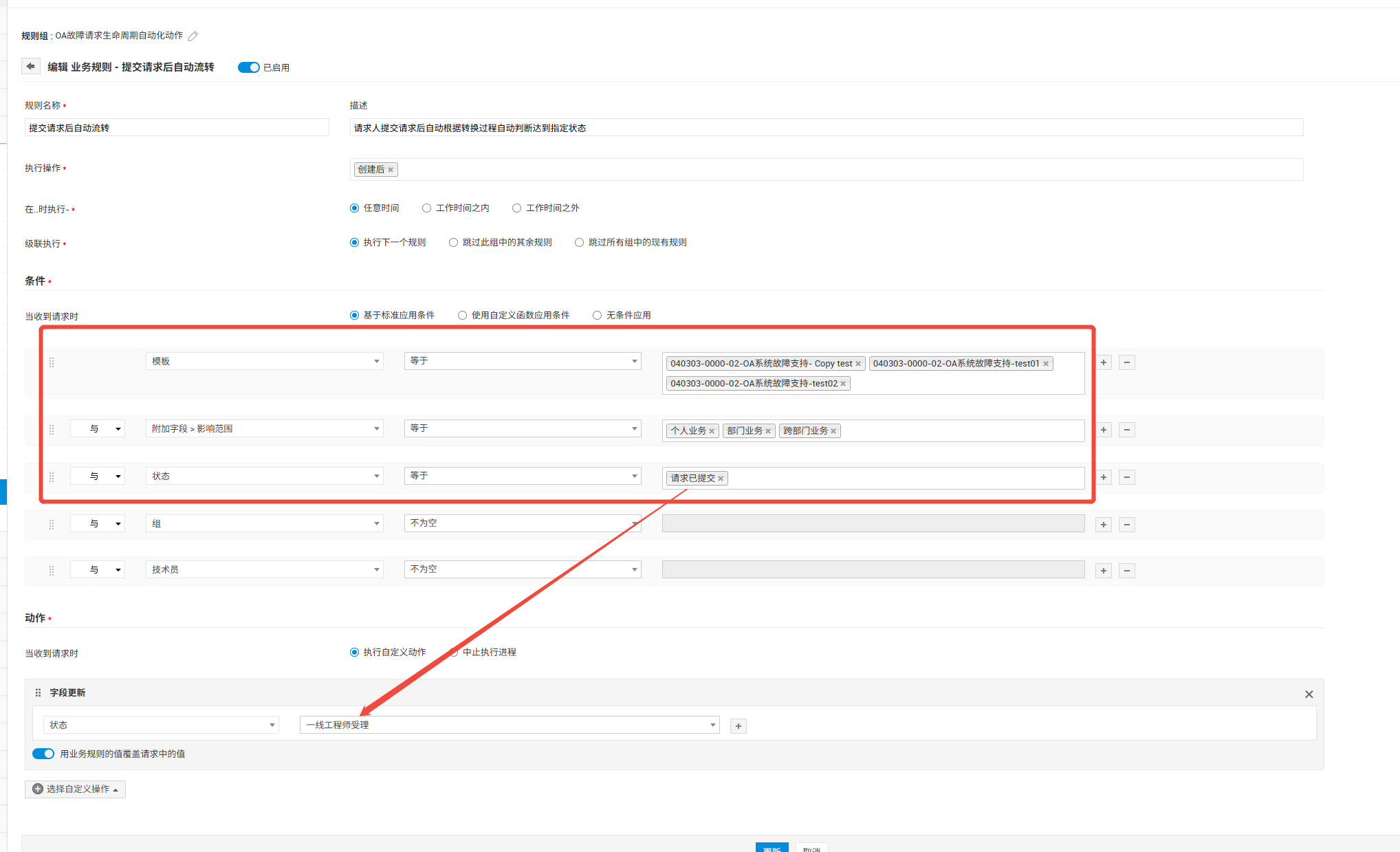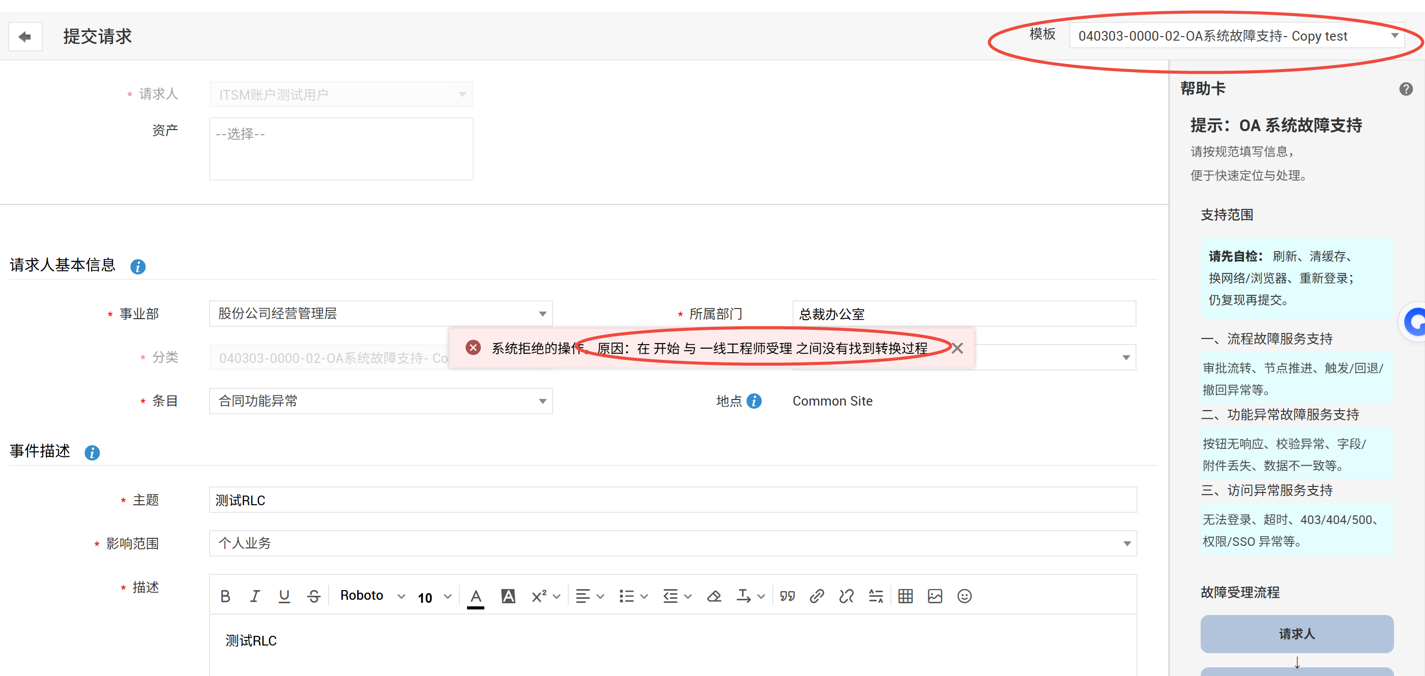 以下是RLC配置,客户设置了业务规则,但实际测试时发现会有第一张图的报错,如果没有配置该规则,则工单将流转至“请求已提交”状态。