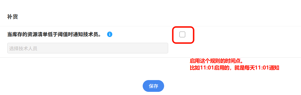 之后每天的这个时间点都会检测一次,当"当前库存数量"低于"库存告警通知阈值"时,就会发送通知。