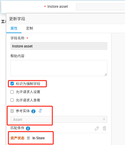 1. 编辑服务模板,在模板上新建一个选择列表类型字段,并参考实体“Asset” 设置条件位“资产状态为In Store” 目的是过滤出在库状态资产