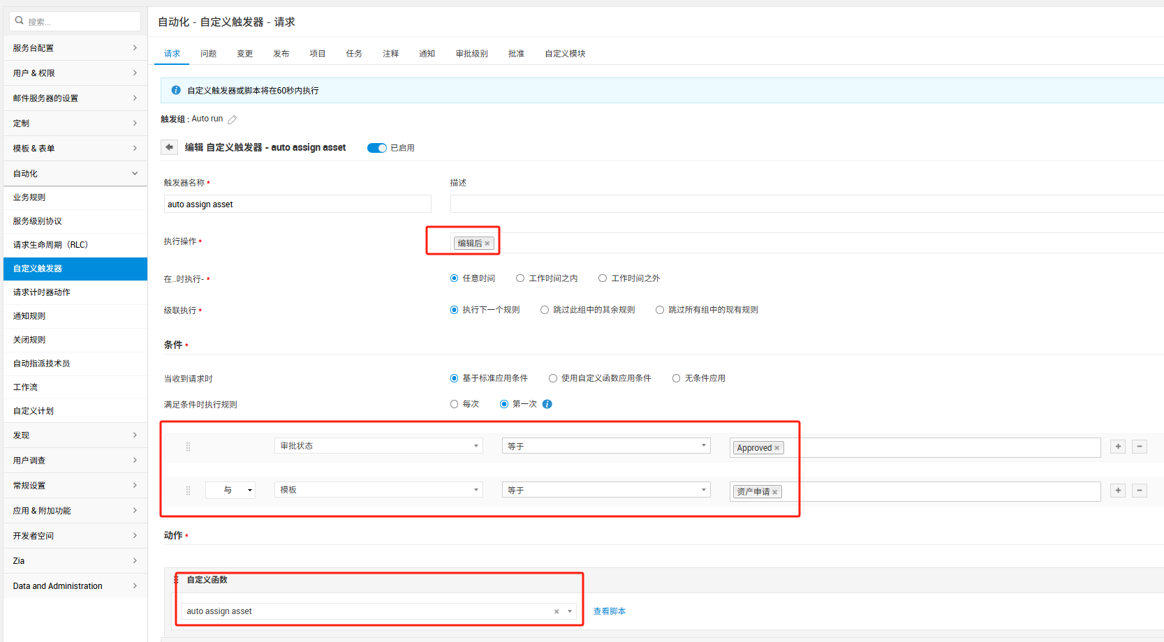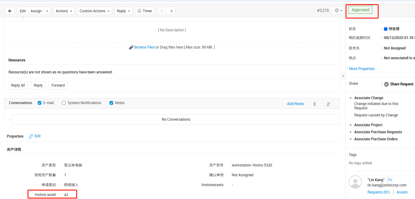 5. 测试创建工单,给出资产,并通过审批,结果选中的资产自动指派给了工单请求人