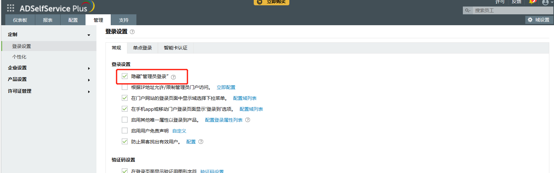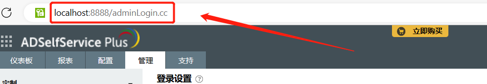 有两种方案可以选择: 1)您可以隐藏“管理员登录”页面,并为用户登录提供单独的页面。 点击管理---定制---登录,在登录设置界面,启用“隐藏管理员登录”选项。这样终端用户登录时的URL为:http://IP地址:8888/showLogin.cc 管理员登录的URL为:http://IP地址:8888/adminLogin.cc 2)您可以完全隐藏域下拉列表。 点击管理---定制---登录,取消选中“在登录页面中显示'登录到'选项”。这样如果admin登录,用户名需要加.\admin